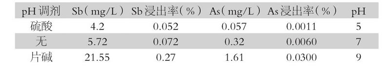 分別稱100g鐵渣 (含銻2.39%, 含砷1.61%) 浸入300ml純凈水中, 加少量的硫酸和片堿調(diào)節(jié)p H, 密封常溫靜置三周后, 分析溶液中的銻砷含量, 水浸試驗結(jié)果見表3。