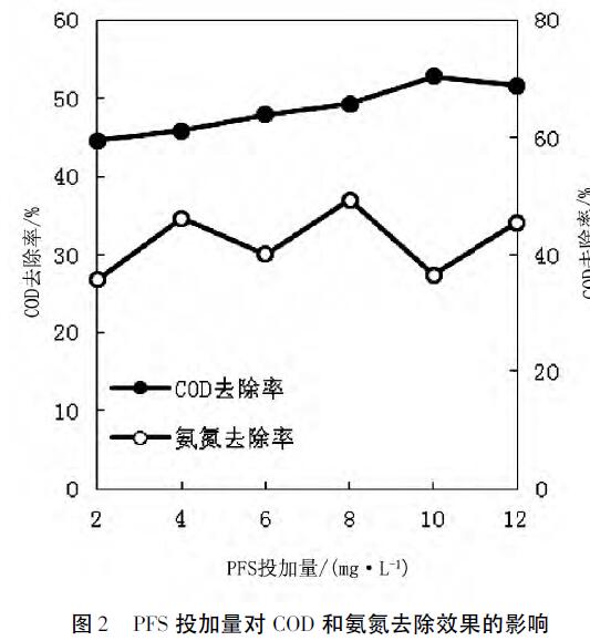 單獨投加不同含量的絮凝劑PFS對經微生物處理過的含油污水中COD和氨氮的去除效果如圖2所示。
