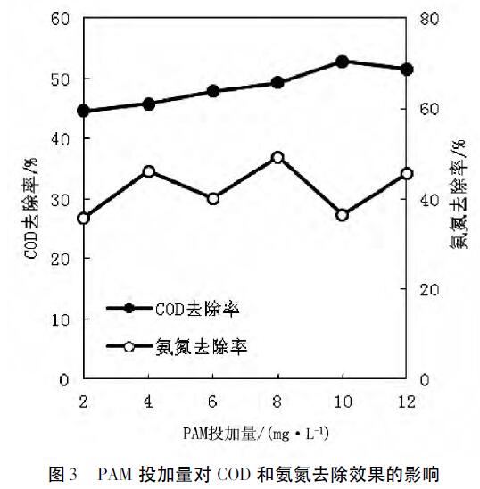 按照PFS的較佳投加量600mg·L-1的標準進行投加,通過改變助凝劑PAM的投加量,測定絮凝后水樣中COD與氨氮的含量,考察助凝劑PAM對絮凝效果的影響,結果如圖3所示。