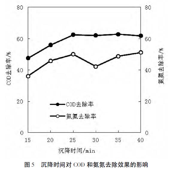 如圖5所示,沉降時間為25min時,COD和氨氮的去除率分別達到62.5%和50.1%,此時氨氮去除率達到較高值。沉降時間為35min時COD去除率達到較高值,為62.8%,由于25min與35min時COD去除率相差僅僅0.3%,此差值可以忽略,因此綜合COD與氨氮的去除率,較佳沉降時間為25min。