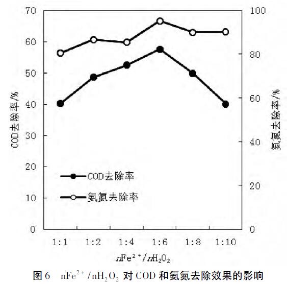 對Fenton試劑氧化處理效果的影響以30%的H2O2溶液的理論投加量為基準加入量,通過改變FeSO4溶液的加入量來控制nFe2+/nH2O2的數值,使nFe2+/nH2O2分別為1:1,11:2,11:4,11:6,11:8,11:10,經處理后測定水樣的COD與氨氮含量,考察nFe2+/nH2O2對Fenton試劑氧化處理效果的影響結果如圖6所示。