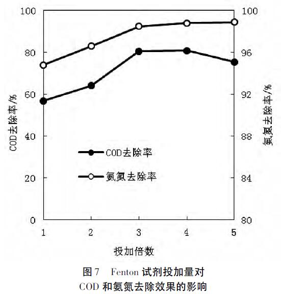 由2.3.1可知,Fenton試劑投加量為理論投加量時,在較佳條件下,COD的去除率也僅僅為57.6%,效果較差,所以有必要提高Fenton的投加量,因此選用Fenton試劑理論投加量的1倍、2倍、3倍、4倍、5倍進行投加,測定處理后水樣中COD與氨氮含量,考察Fenton試劑投加量對氧化處理效果的影響,結果如圖7所示。